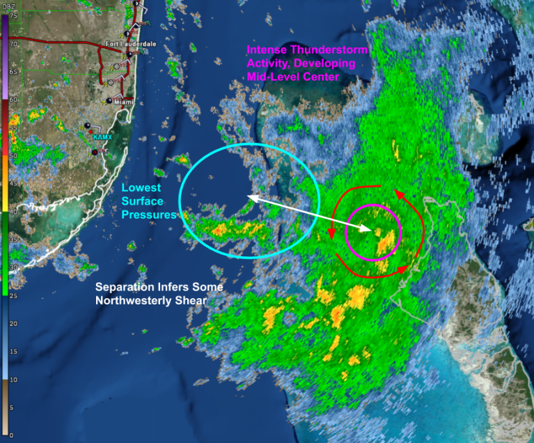 TD-19 is close enough to the Miami radar that we can actually get some pretty good information about the system’s structure by peering under the cirrus canopy and into the lower-level parts of the storm. The mid-level circulation is located in the cluster of intense thunderstorms just off Andros Island while the lower-level center (lowest surface pressures inferred by observations in Florida and buoys/ships offshore) is a bit northwest over the Florida Straits. This infers the presence of some light northwesterly wind shear which is preventing the system from becoming fully aligned.