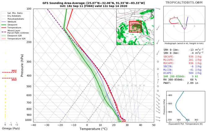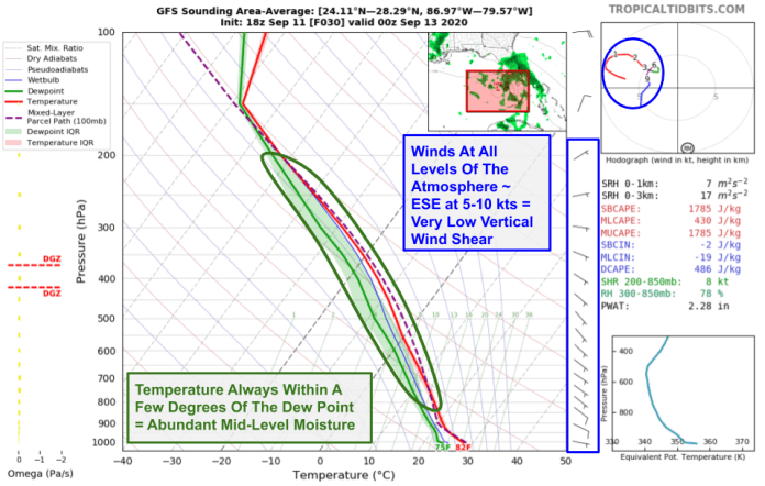 This area-averaged sounding over TD-19 tomorrow evening shows no dry air or wind shear in sight as the system sits within a very moist environment characterized by nearly uniform east-southeasterly winds between 5 and 10 kts. This basically means that there’s very little if anything holding TD-19 back as it moves into the eastern Gulf on Sunday.