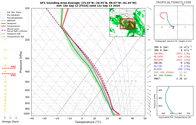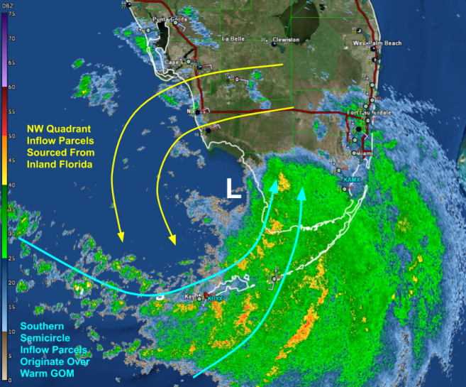 I made this graphic earlier today so the radar data isn’t “fresh” but it highlights the process well. Low-level air parcels (think right near the surface) flowing into the northwestern side of Sally have spent considerable time over the Florida Peninsula instead of over the warm waters of the Gulf of Mexico. As a result, they’re a bit drier than they need to be to support convection. Parcels flowing into the southern side of the system have spent considerable time over the Gulf of Mexico picking up moisture and heat from the warm water beneath them. As a result, these parcels are jam packed with energy to support convection in a way that those parcels originating over Florida are not.