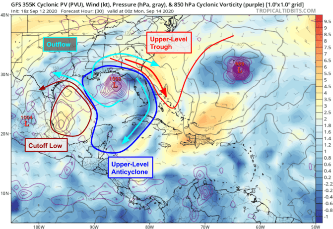 For most of last night, that was due to northwesterly shear imparted on the system by an upper-level low to its northwest. This evening, that low is weakening and moving away from the system so I don’t anticipate we’ll see shear continue to be an issue for Sally as we move into tonight.