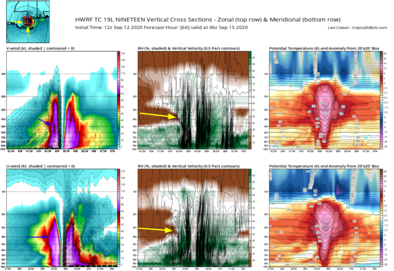 Storm-centered cross sections on the HWRF model show the potential for some dry air intrusion as the storm nears the SE Louisiana coastline. It’s really hard to tell ahead of time how exactly the storm will interact with this type of dry air/shear. If its inner core is intense enough, it will barely notice this level of disruption (a la Laura). If the inner core is still struggling to get together, it could weaken quite a bit (Marco was an extreme example of this, though I wouldn’t expect that much weakening from Sally). I include this in here not to downplay the threat from Sally but to offer a little bit of hope that the door is still open to a lower-impact scenario. Prepare for the worst and hope for the best.