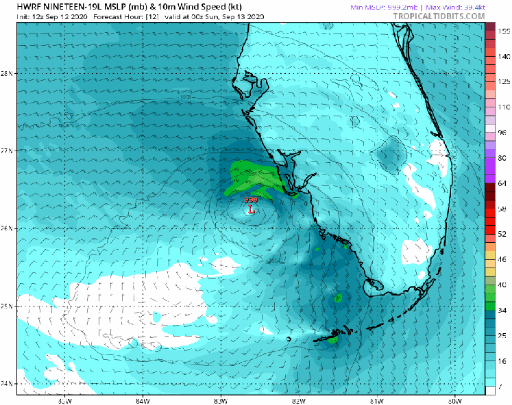 The HWRF model, which is a high-resolution model specifically designed to predict hurricanes, shows this idea well. It depicts Sally struggling to organize until it passes north of 28N which is about where Tampa is. After that, it has a bit more “room to breathe” on the northern side and as a result is able to strengthen quite a bit more.