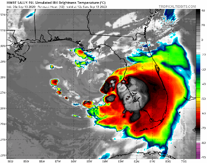 This animation shows the HWRF’s prediction of what satellite imagery might look like between now and the storm’s landfall. Note that even in this bullish model depiction of Sally’s intensity, the eye only shows up clearly once the system is directly over New Orleans!
