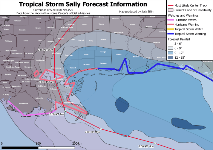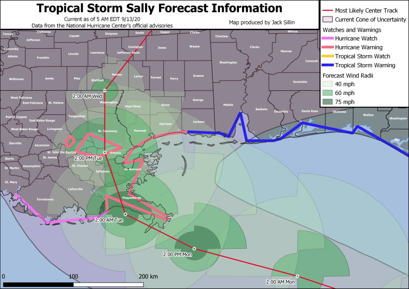 This map is zoomed in near where Sally is expected to make landfall in southeastern Louisiana and shows the storm’s forecast track, intensity, and storm surge. Note that areas outside the New Orleans levee system could see over nine feet of storm surge inundation as Sally’s circulation pushes water from the Gulf of Mexico west and northwest towards Lake Pontchartrain. As someone unfamiliar with the New Orleans levee system, I do not know which levees might or might not be in danger of failure from a surge of this magnitude. Local officials in this area do have that information, and if they tell you to leave, please make every effort to do so. If you don’t have the resources to evacuate, please get in contact with your local officials who will likely be able to assist you with transportation, accommodations, etc.