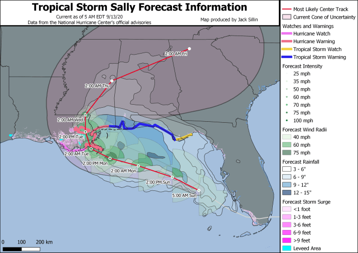 This map shows the storm’s expected track, intensity, and rain/wind/surge impacts as well as the watches and warnings in effect as of 5 AM EDT. Click the map for a larger version that’s a bit easier to read. The key idea to take away from this graphic is that serious impacts, especially heavy rain, will extend relatively far from the center of Sally, especially to the east. So folks in the Florida Panhandle and southern Alabama shouldn’t let their guard down despite not being near the center of the cone (or in the case of most of FL, outside the cone entirely).