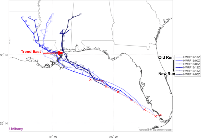 Yesterday, most guidance took Sally into SE LA before moving NW very near New Orleans then into SW MS or NE LA. Newer model runs are now suggesting the system may turn towards the north before reaching SE LA and instead make landfall in S MS. The HWRF does a particularly good job highlighting this trend, though it would work with any model of your choosing.