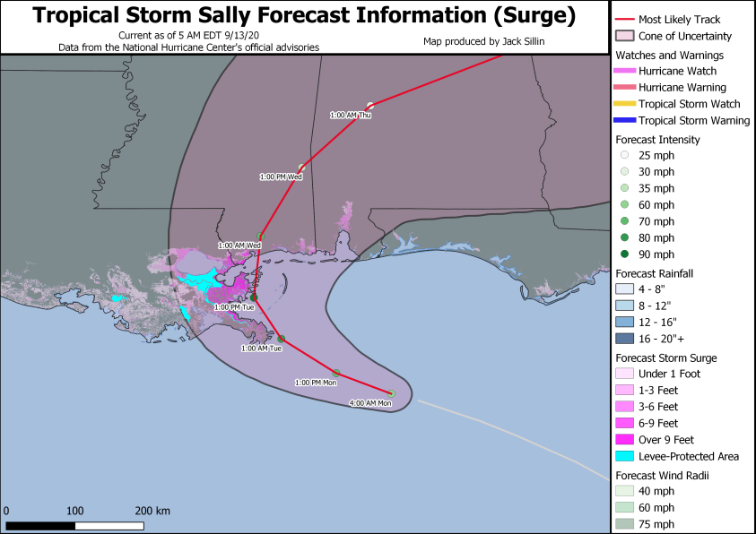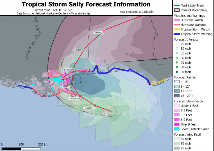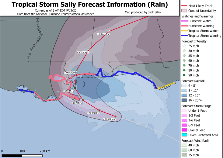 Note that the highest surge, heaviest rain, and strongest winds are all focused near and just east of the center’s expected track. If the storm continues to strengthen today and ends up tracking a bit farther east, the worst of the storm would slide from near Biloxi MS closer to Mobile AL. Folks in this area should be preparing as though this were expected to happen. It’s also important to note that even on the storm’s current heading, one to two FEET of rain is expected for much of the MS/AL/W FL panhandles. Even if you don’t get Sally’s worst surge or winds, the rain is going to cause some serious flooding issues.