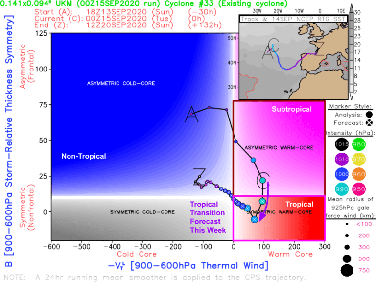 This graphic shows the cyclone’s expected evolution from “asymmetric warm core” or subtropical (which is where it is right now) towards “symmetric warm core” or tropical by later today/tomorrow. Even if the storm does become tropical, it will weaken substantially before impacting Portugal in four or five days. But perhaps the storm could snatch the name “Wilfred”, leaving the wave in the eastern Atlantic to become “Alpha”.