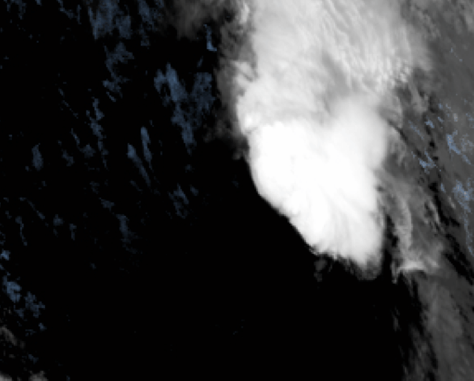 Sunrise over Vicky reveals a cyclone being acutely impacted by strong southwesterly wind shear. Notice how the storm’s low-level swirl is displaced significantly from its deep thunderstorm activity. This shear is being delivered by a strong upper-level low to the northwest of Vicky and will bring about the system’s rapid demise later today.