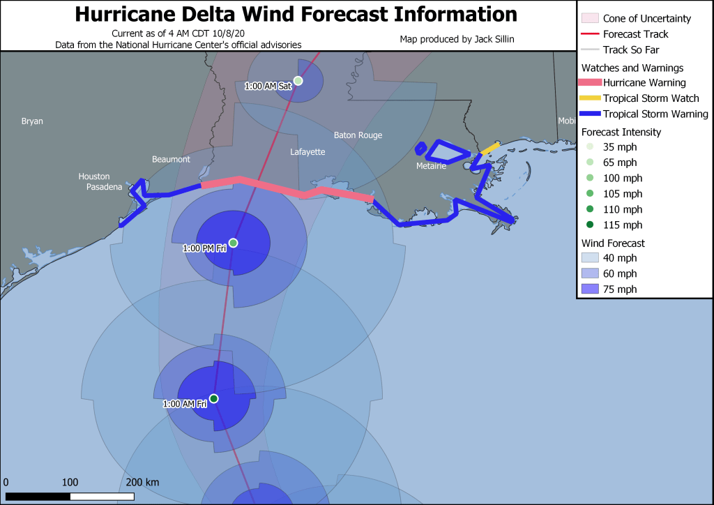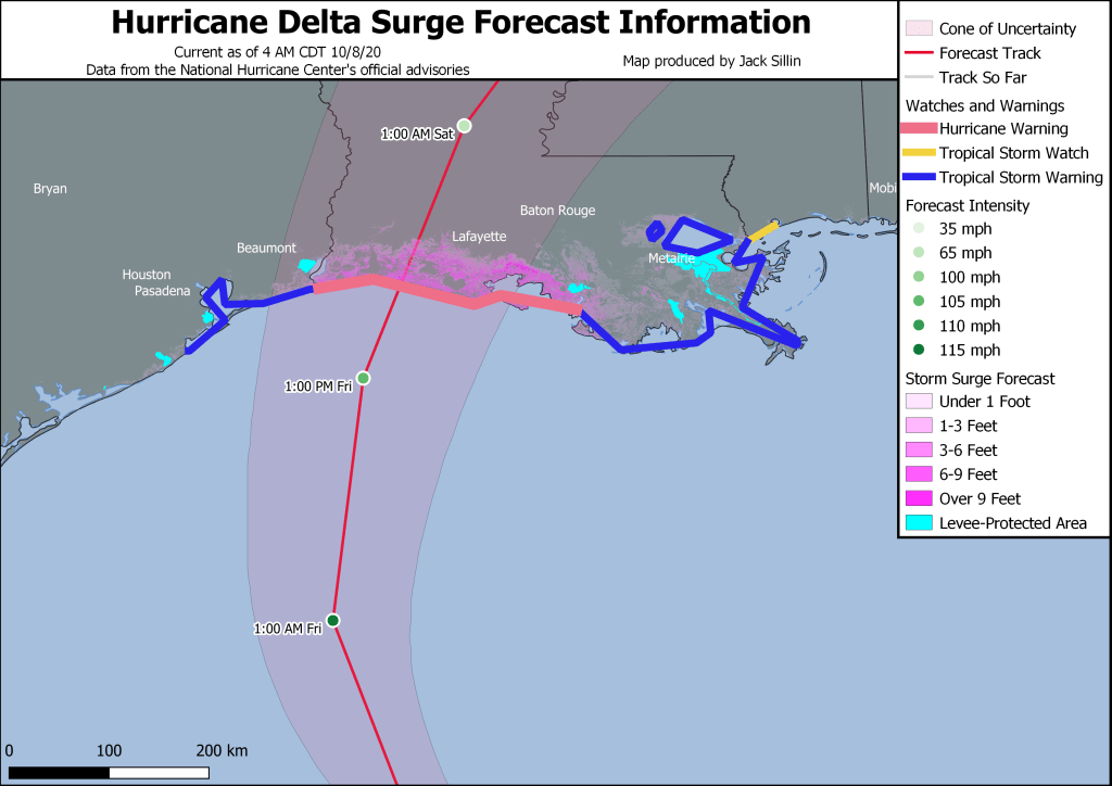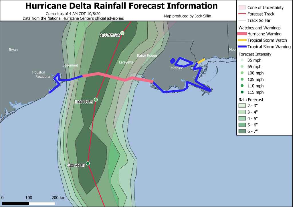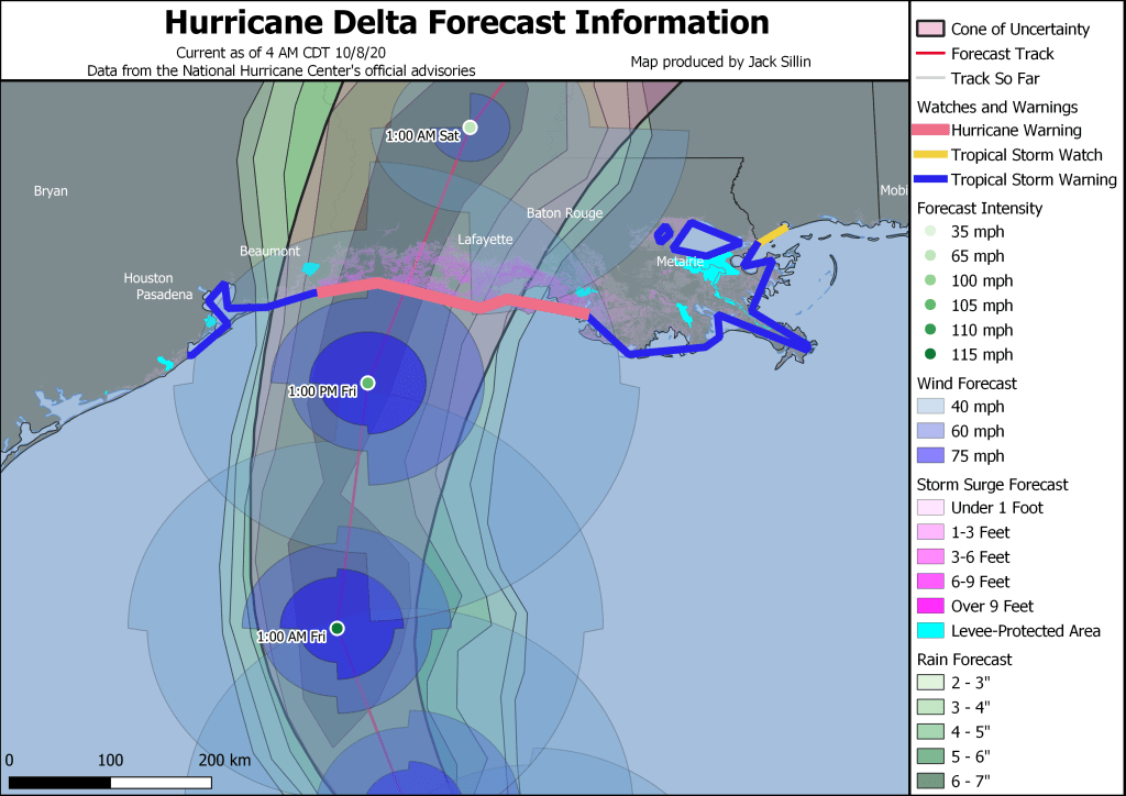 This map is an overview of the National Hurricane Center’s forecast for Delta’s track, intensity, and rain/wind/surge impacts. The areas most seriously impacted by the storm will be along the coast between Lake Charles and Lafayette Louisiana, as well as points inland. Unfortunately, many of these areas are still recovering from the devastation of Hurricane Laura just six weeks ago.