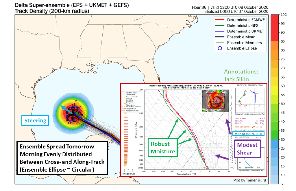 As Delta turns north today, the biggest question will be how quickly it’s moving. Ensemble members are in excellent agreement about the general track of the storm. Landfall will occur somewhere in SW Louisiana (exact town dependent on wobbles etc.) it’s just a matter of figuring out when. The current NHC forecast calls for landfall sometime late tomorrow afternoon. The range of possible outcomes in my mind is somewhere between midday tomorrow and early Saturday morning. Either way, today’s the last full day of relatively quiet weather during which you can safely prepare for the storm.