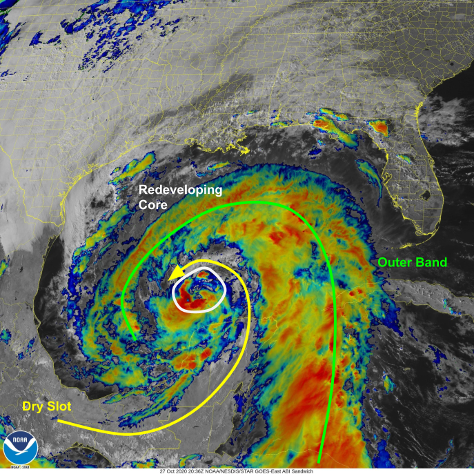 A look at satellite imagery this afternoon shows a very broad system with a dry slot separating the inner core from the primary outer band. This dry slot exists because air originating over southern Mexico and moving over the Yucatan Peninsula can’t pick up much if any moisture as it travels over land rather than water.
