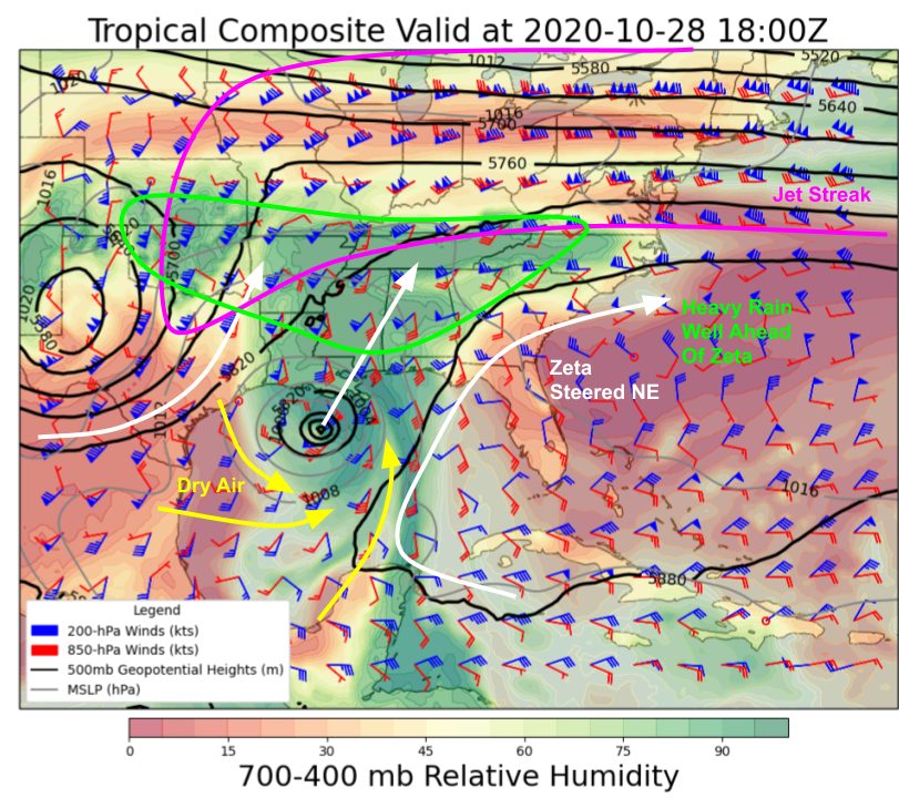 With generally favorable conditions and ongoing convective development, expect Zeta to reintensify into a hurricane tonight as it moves NW then begins to turn off to the north. That turn will take place as the storm begins moving between a strong ridge of high pressure over the Atlantic and a strong upper-level low over Texas as seen in the graphic below.