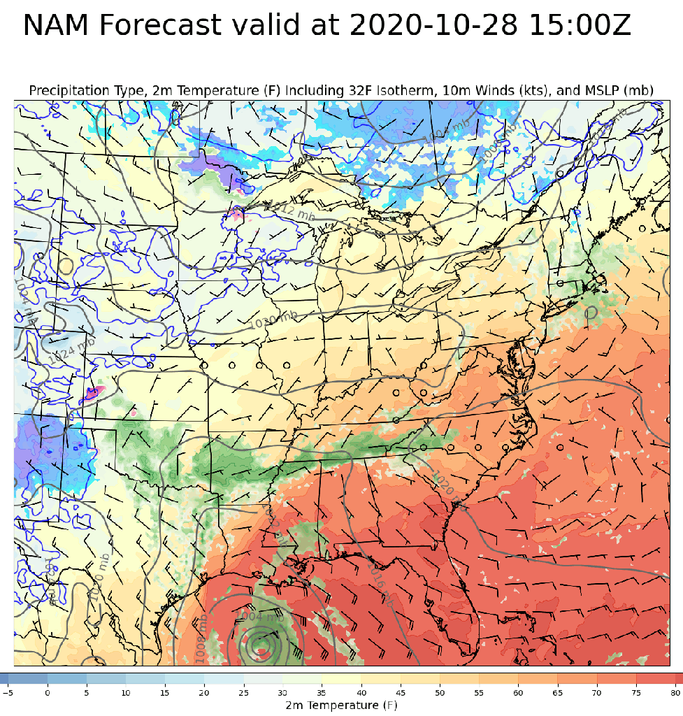 The current NHC forecast, shown above, expects Zeta to make landfall in SE Louisiana as an 80 mph hurricane tomorrow afternoon/evening. The storm’s biggest threats will be high winds that will continue well inland into MS/AL as well as storm surge near the coast. Surge may exceed 5-8 feet in parts of SE Louisiana that are not protected by the levee system as well as parts of southern Mississippi and the southwestern coast of Alabama.