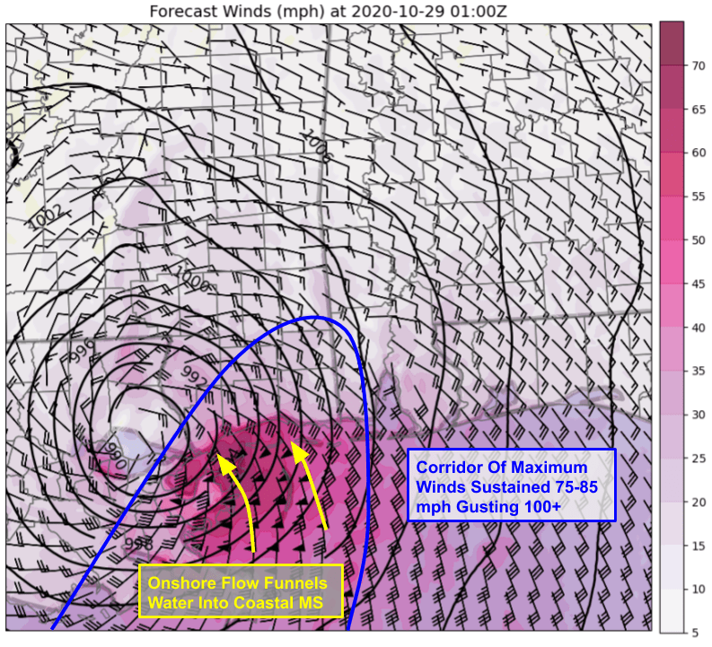 High resolution forecast model guidance provides a good look at how Zeta’s wind field will look as it moves ashore even though the numbers on this map will be an underestimation of actual winds. Note that the strongest winds will be focused east of the storm center’s track. This means that places along the Mississippi coastline 30-50 miles east of the center will see significantly stronger winds than parts of Louisiana 10-15 miles west of the center.