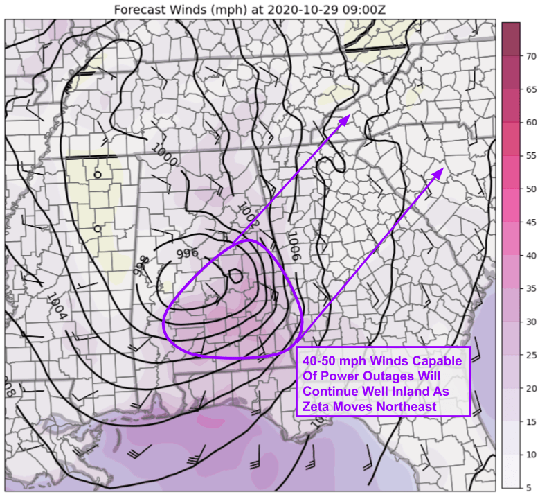 Even as the storm races through central Alabama and begins to lose its tropical characteristics early tomorrow morning, it will still be producing a region of 40-50 mph winds capable of producing damage to trees and power lines. These winds will move into northern Georgia later tomorrow morning. Folks in these areas should be ready for power outages even after Zeta weakens below hurricane strength.