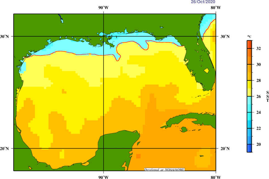 However, the water doesn’t get cold (<26C) until the last 50 miles or so before Louisiana. So it’s possible that favorable jet stream dynamics (upper-level divergence) could help Zeta continue strengthening so long as ocean temperatures aren’t unsupportive of convection. This is the scenario consistent with NHC forecasts and its the scenario folks in the path of the storm should be ready for. At this point, with the storm structure appearing as robust as it is and the storm’s forward motion being so fast, I don’t think we’ll be able to sneak much weakening in during the hours just before landfall.