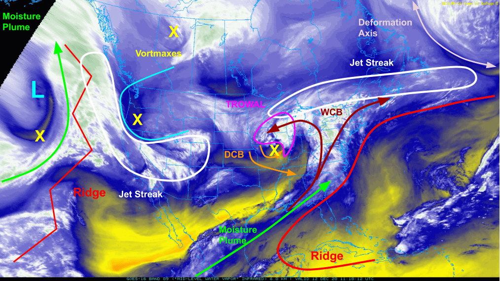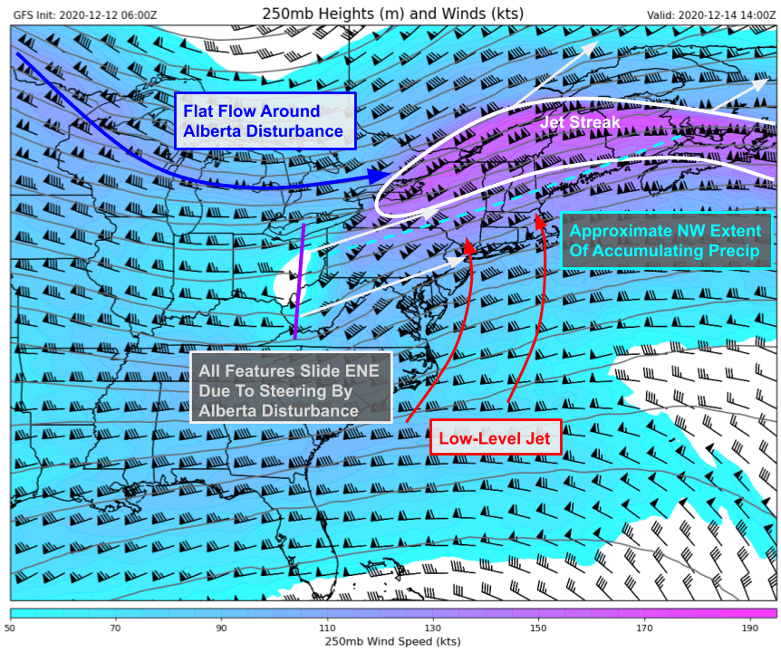 A look at upper-level wind forecasts shows a favorable setup for northward moisture advection into the right entrance region of a jet streak that curves right as you move east along its axis (meteorologists call this “anticyclonically curved”).