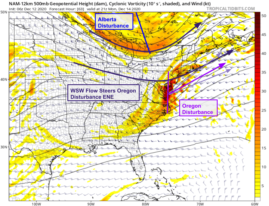 Current forecasts show the Oregon disturbance east of the Alberta disturbance on Monday evening as it approaches the East Coast, but not by much. Perhaps more critically, the Alberta disturbance is sliding ESE rather than digging SE. That means that the prevailing flow responsible for steering the Oregon disturbance (and our storm) is more west-southwesterly than southwesterly. The result is a track towards the ENE rather than NE. So this won’t turn into a blockbuster blizzard until it gets up to Newfoundland. That doesn’t mean we don’t still have some unanswered questions about just how far northwest precipitation might be able to reach.