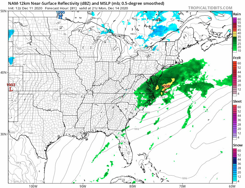 This loop shows the last four forecasts from the NAM model for precipitation and sea level pressure all valid Monday evening. Note that the original forecasts showed low pressure slipping offshore without much if any precipitation over the Northeast. The latest forecast has a solid moderate snow event for much of the coastal Northeast as the low tracks a bit closer to the coast.