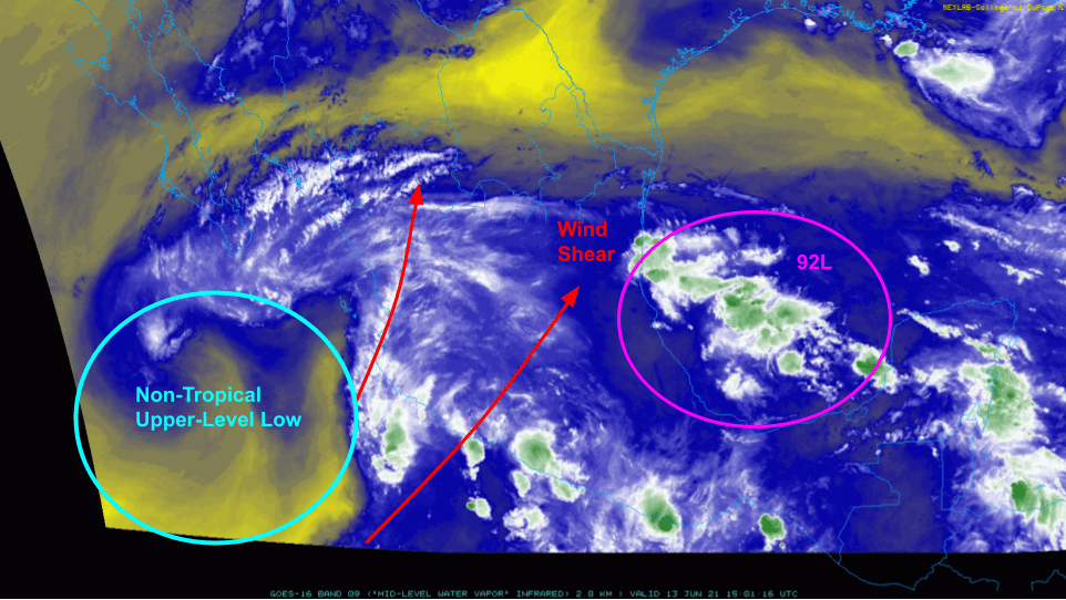 Water vapor satellite imagery of 92L and its surroundings shows the system’s environment dominated by a non-tropical upper-level low to its west. Because this feature is non-tropical, it boasts counterclockwise winds at all levels of the atmosphere (this is different from hurricanes which spin the other way near the top of the atmosphere). The southwesterly winds aloft provided by this low will impact 92L in two important ways: it will steer the storm gradually to the north or perhaps north-northeast, and it will make the consolidation of a tight inner core of intense thunderstorms more difficult.