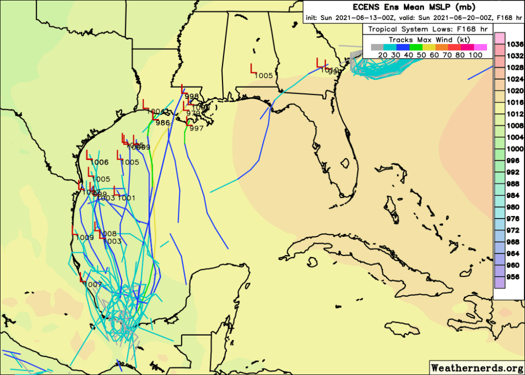Most ensemble member forecasts for 92L confirm the forecast intuition we developed from that satellite image. Most members show at least some development of the storm as it wobbles ever so slowly north. All the little “L”s on the map show one possible spot the storm could be in a week. Also note that most of the members keep the storm rather weak, with max winds somewhere between tropical depression (20-30kts) and moderate tropical storm (40-50kts) strength. At this point, 92L looks unlikely to become a hurricane, though it’s still a smidge too early to entirely rule out that possibility.