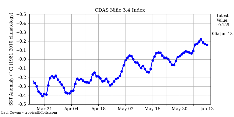 Over in the Pacific, ocean temperatures in the area we watch for to decide whether we’re experiencing “La Nina” or “El Nino” conditions have been warming this spring. Temps are still too cool for El Nino, but taking the edge off the La Nina we saw last year may also help temper Atlantic hurricane activity later in the season.
