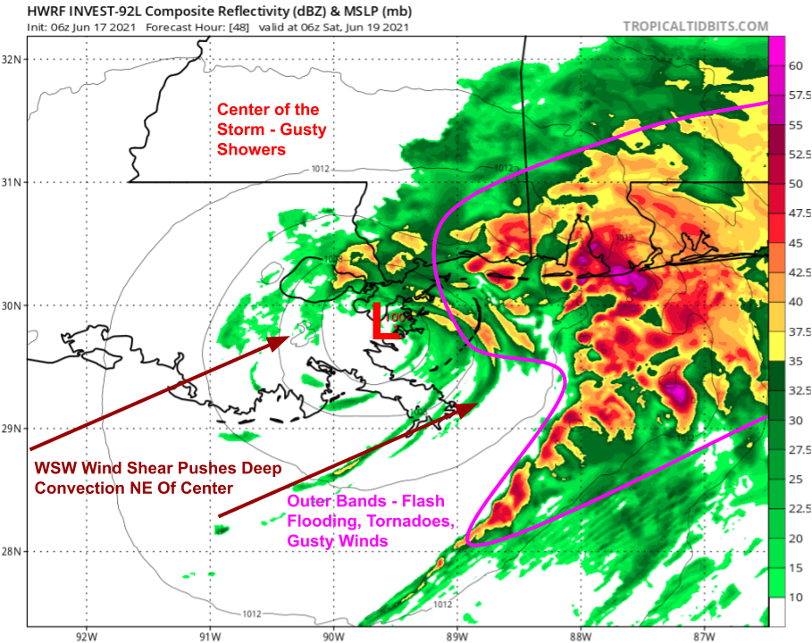 This is because moderate to strong WSW wind shear will be pushing most of the system’s intense thunderstorm activity away from the center and towards the northeast. So while areas near the center will see gusty showers, the flash flooding and tornadoes most likely to cause serious damage will be found dozens or even hundreds of miles to the northeast.