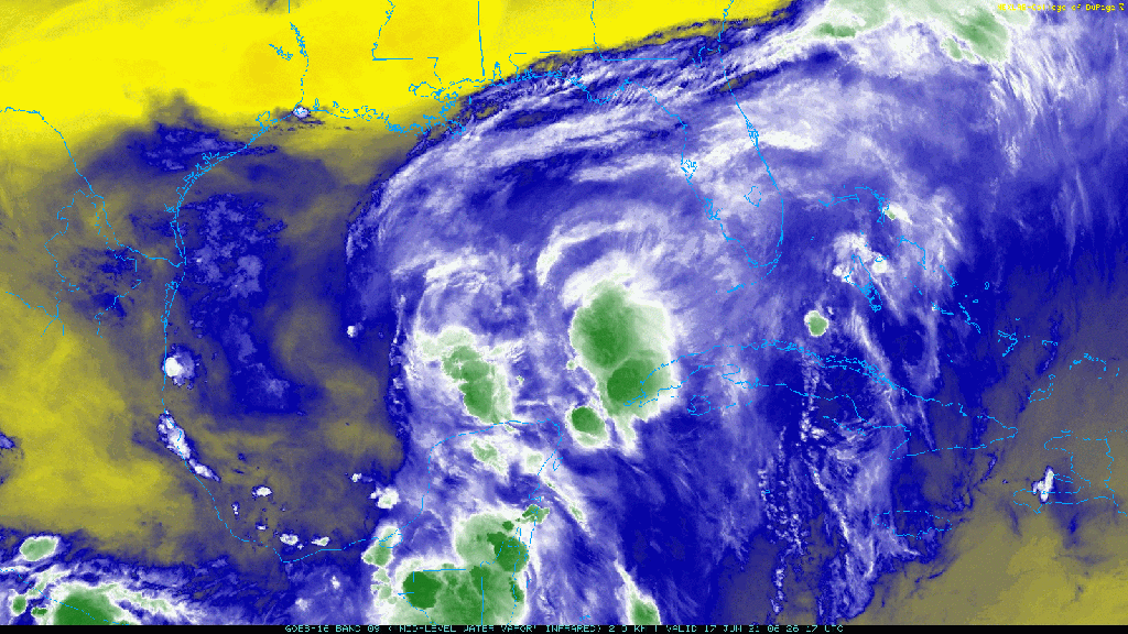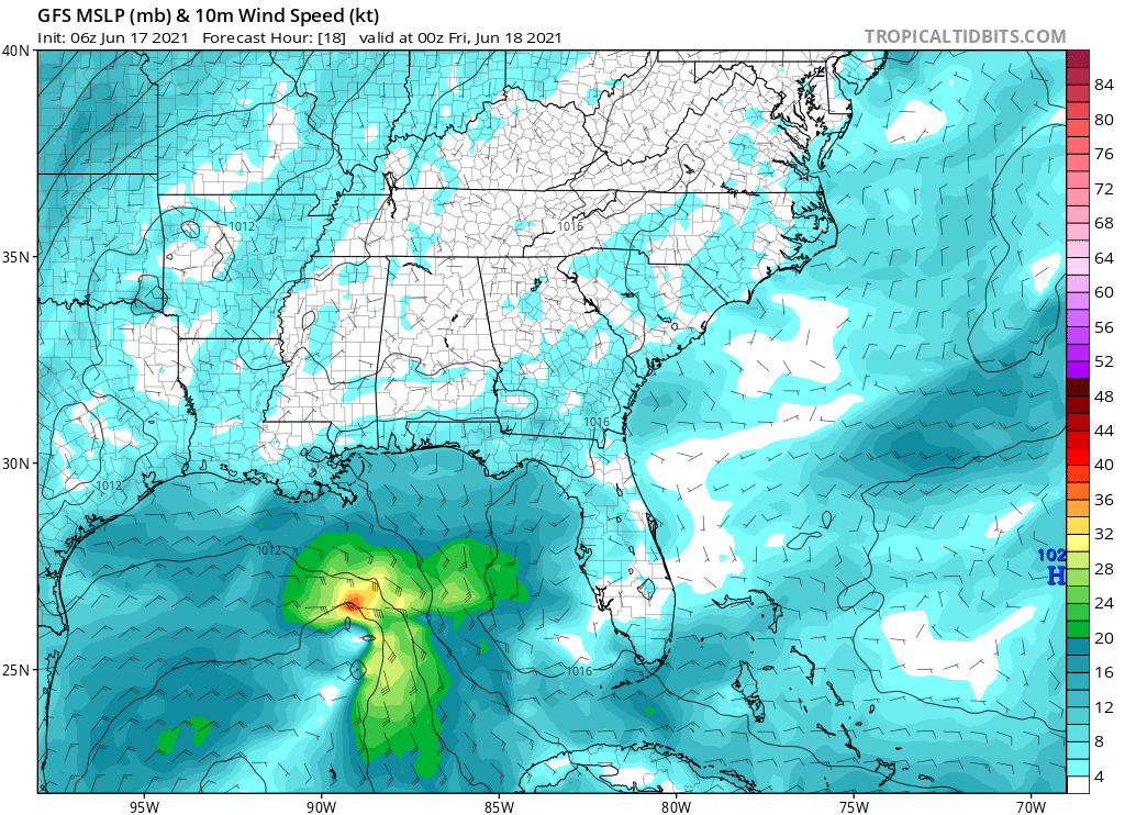 In this GFS forecast frame valid this evening at 7 PM CDT, you can see 92L’s tight circulation emerging south of New Orleans and northeast of the broader low/trough over the Bay of Campeche. Given the prevailing easterly flow in this area, it will take some effort for 92L to produce ground-relative westerly winds in order to close off its center of circulation, but with enough deep convection it could certainly get the job done.