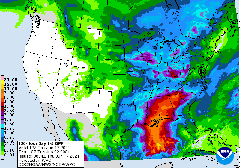 Keeping in mind that the center of 92L is most likely to make landfall over central LA, the WPC precipitation forecast does a good job highlighting the discrepancy between the central landfall location and the most severe flooding impacts which will be felt from New Orleans east to the FL Panhandle. Flooding rains of 3-6″+ could extend as far inland as TN and NC depending on how well the system holds together as it accelerates off to the northeast.
