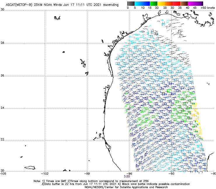 Satellite-derived wind estimates show broadly cyclonic flow (counterclockwise rotation to the winds) over this area, but there’s no clear center of circulation where winds rapidly shift from SE to NE to NW to SW. If you look closely though, there’s a subtle wind shift over the Central Gulf near about 92W/23N.