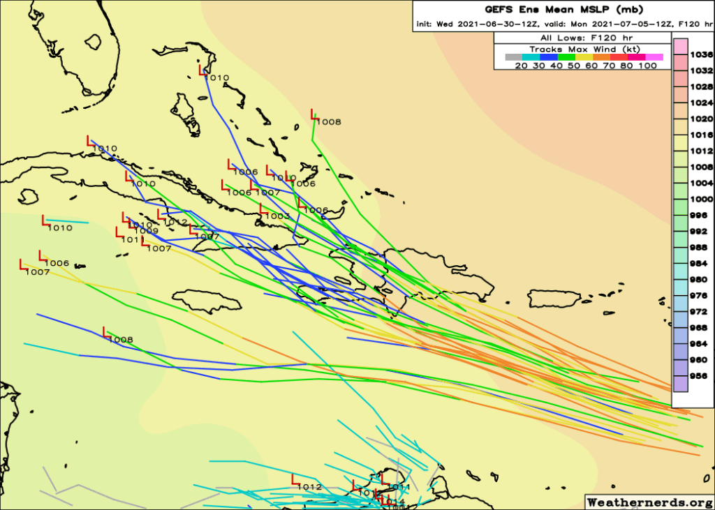 Another reason to be skeptical of PTC5’s intensity potential in the medium-range is interaction with the tall mountains of Hispaniola and Cuba. Even the most aggressive GEFS members which show PTC5 becoming a hurricane in the eastern Caribbean (possible albeit not the most likely outcome) indicate the potential for rapid weakening as the storm moves over land. If PTC5 can stay farther south and avoid a landfall in Hispaniola or Cuba this weekend, it would have a better shot at maintaining its identity as a tropical cyclone.