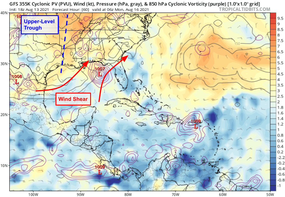 As Fred is dealing with an upper-level trough over the Gulf of Mexico, TD7 will be dealing with its own trough near Puerto Rico. The resulting shear and dry air would likely be near-fatal for TD7 especially if it follows Fred across the mountains of Puerto Rico and Hispaniola. Unlike Fred though, TD7 has the option of fighting back.