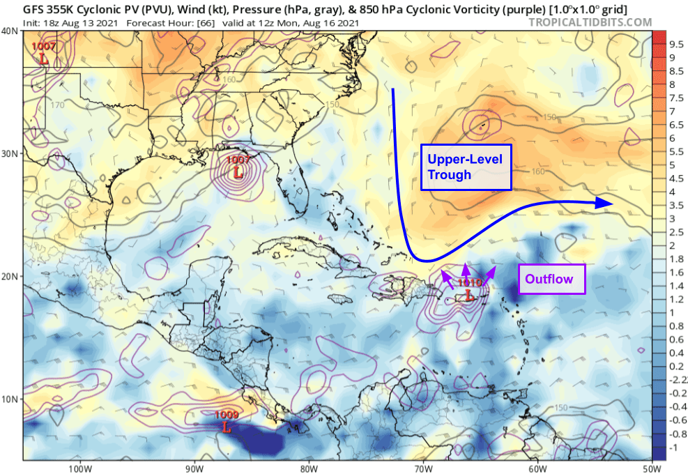 If TD7 strengthens enough (strong TS or hurricane) before arriving in the Lesser Antilles, its upper-level outflow would be strong enough to push back on the trough to its northwest. This would allow the storm to maintain an envelope of favorable conditions for maintenance/intensification. TD7’s odds of success in this endeavor are somewhat modulated by the intensity of TS Fred. Fred’s outflow will be acting to build up the ridge pushing this trough southeast towards TD7. The stronger Fred is, the farther SE this trough will be pushed and the harder it will be for TD7 to push it back NW. So there’s a bit of tug-of-war here which adds some extra uncertainty into the forecast.