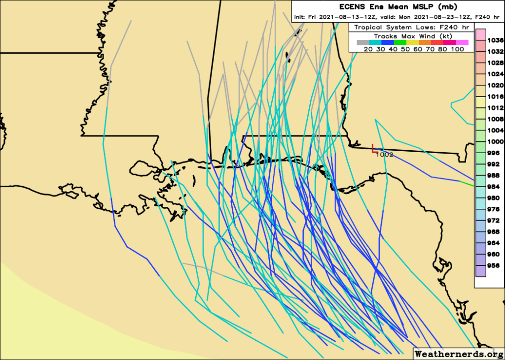 Assuming TD7 remains on the weaker side, it will continue to be steered west-northwest basically in Fred’s footsteps. If TD7 is a bit stronger, it would start to feel a weakness in the upper-level ridge to the storm’s north on Monday/Tuesday. This would open the door for a track a bit farther to the north as shown in the ensemble forecast above.