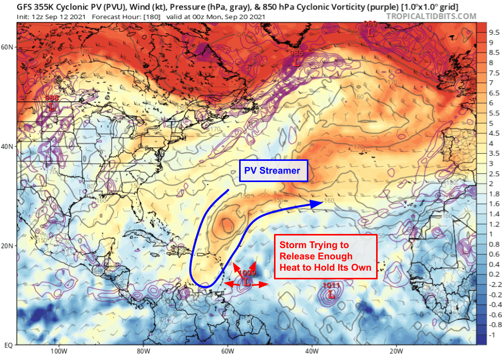 Some model guidance suggests there will be a “PV streamer” or pocket of cold air aloft northeast of Puerto Rico as this system approaches the Lesser Antilles. This is a useful place for a feature like this if you’re in the Caribbean because if the storm is on the weaker side (TS/Cat 1), it will probably get ripped apart by the PV streamer’s shear. If the storm is stronger, it might be able to bully the PV streamer with its outflow, but it is also more likely to get steered more north by the PV streamer’s southwesterly flow aloft.