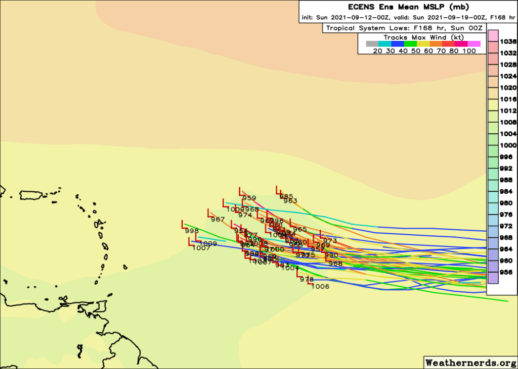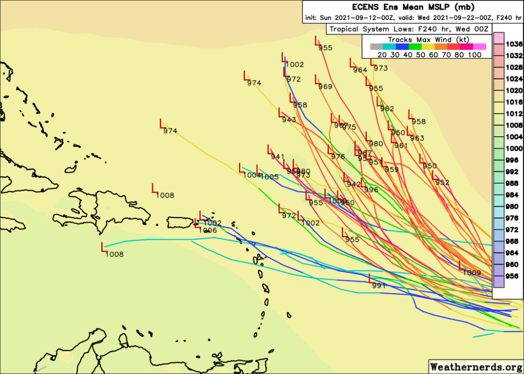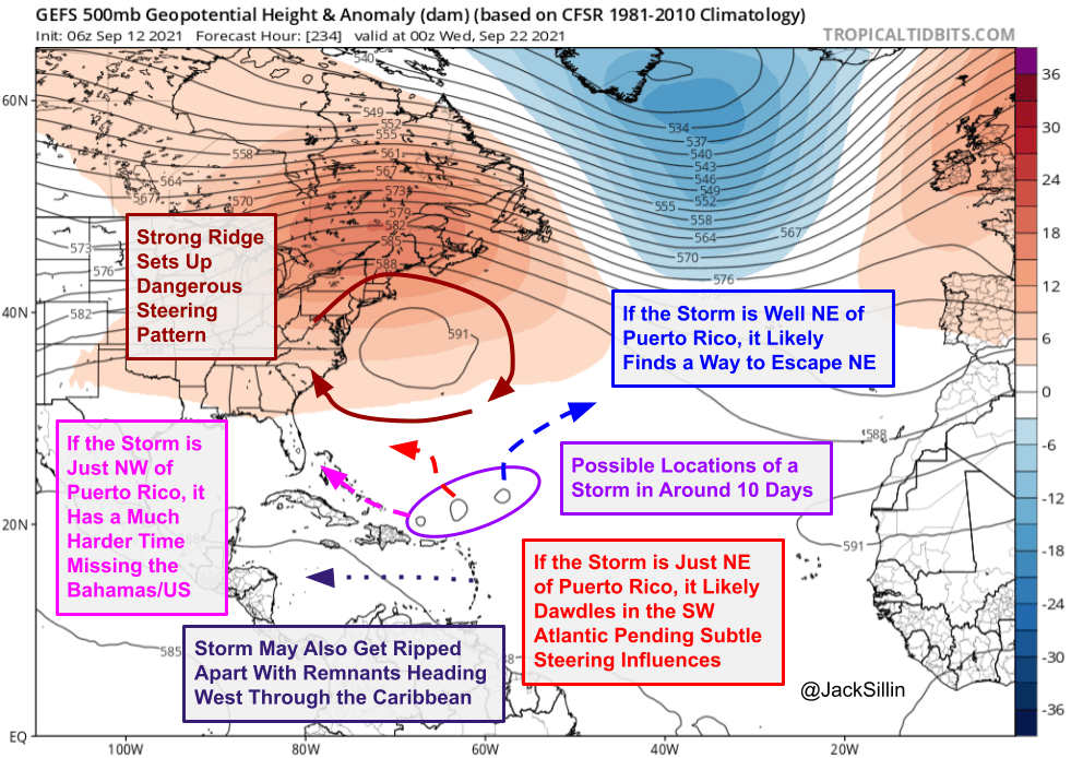 Ensemble forecasts currently suggest the most likely position for the storm around 10 days from now is somewhere north or northeast of Puerto Rico. If that ends up being the case, we’d have to watch very carefully for more subtle steering influences that could either let it dawdle over the open ocean south of Bermuda or potentially head west. However, a storm that’s a bit faster and ends up north or northwest of Puerto Rico could end up being a significant concern for the Bahamas and the US East Coast.