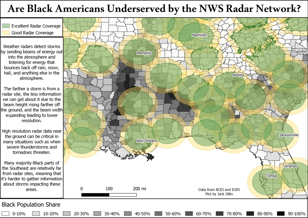 Sure enough, when I overlaid demographic data onto the radar coverage map, it becomes clear that much of the Black Belt, a corridor of largely Black communities stretching from southern Arkansas into central Georgia, is too far away from radar sites to have good low-level radar coverage.