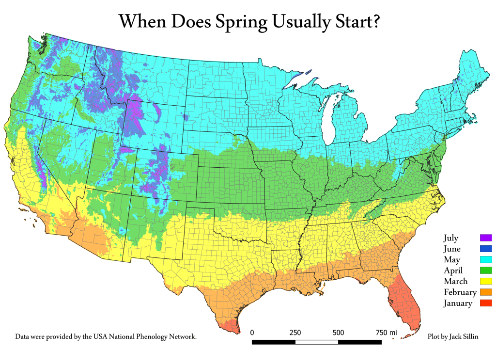 I usually think of spring as really being when the brown landscape left by the melting snow turns to green. I made this map using data from the US National Phenological Network showing when, on average, leaves come out and flowers start blooming.