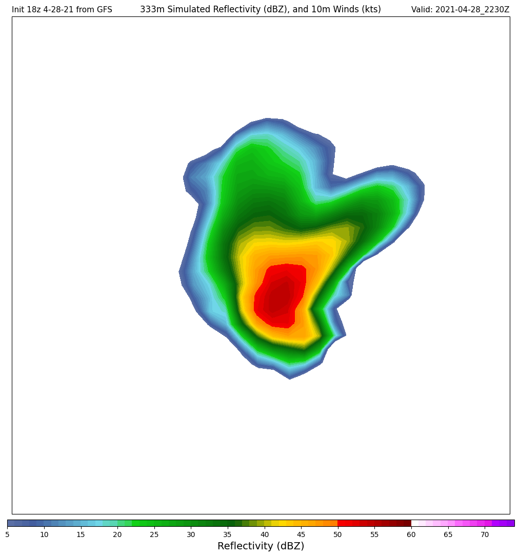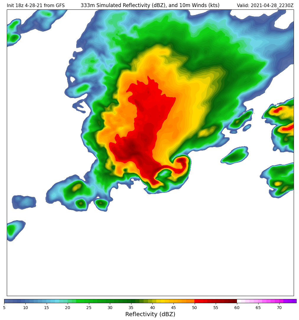 As the slider on the image above demonstrates, there are many details that emerge when the model grid spacing decreases from 3km to 333m. The storm’s hook echo is much better defined, as are fluctuations in the rear flank reflectivity field and smaller cells trailing and leading the main storm.